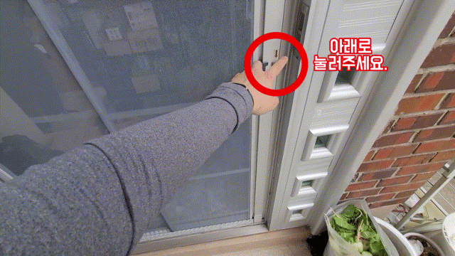 ▶ 회색 버튼을 아래로 내려주면 잠금이 풀리면서 방충망이 개방.